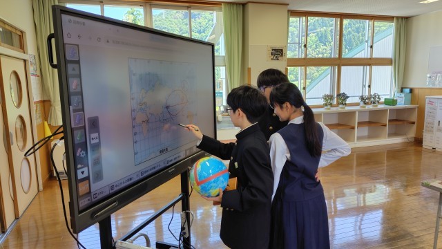 1年生は社会の地理で地図と地球儀の違いをしました。2点間の都市の最短経路を地球儀で確認し、地図上との違いを調べました。