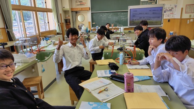 3年生は理科でイオンと化学式でこの前の実験結果をまとめていました。今から全員で協力して完成させようとがんばるぜ!と気合いのポーズをとっていました。