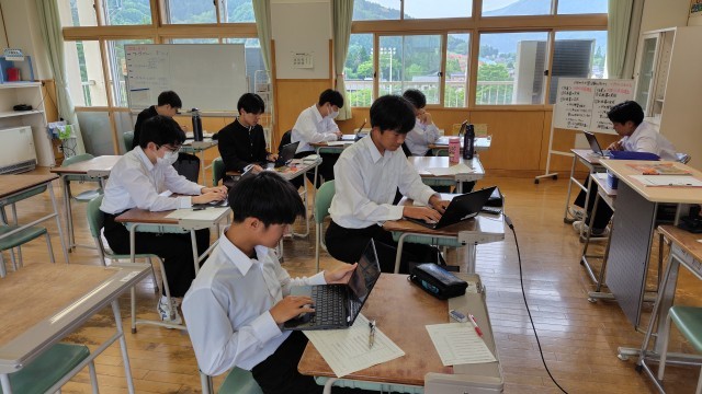 3年生は社会で第二次世界大戦の国際関係からポツダム宣言までを調べていました。できた生徒はテレビとつなぎ発表の練習や自学プリントで復習をし、スライドで取りこぼしのある言葉をさらに付け加えて修正をしていました。