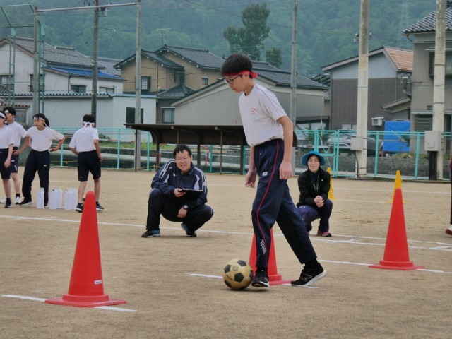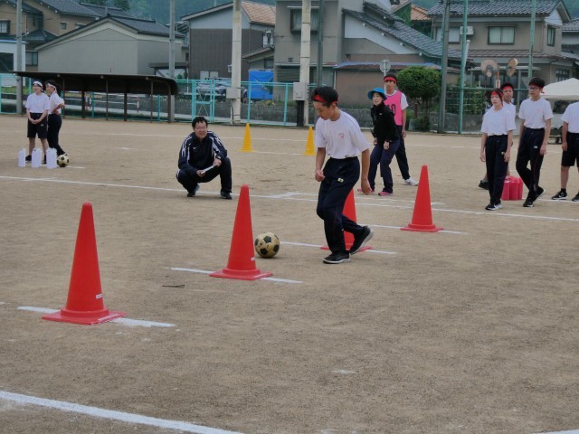 2種目目は「ドリブルリレー」はコーンの間を素早くドリブルするもので、やってみると意外に難しい競技です。飛ばしてしまったら戻ったり、2つ飛ばすと最初からなので慎重かつ素早くやることが大切な競技です。