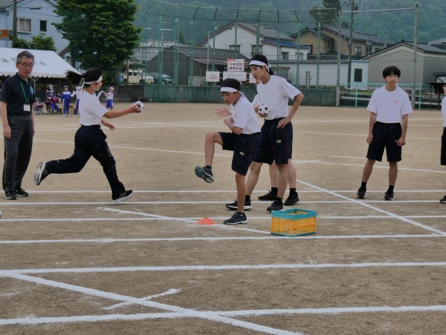 3年前から毎年3年生がルールなどを含めて企画した競技を行っています。一昨年は楡中で「最強目指してみた(しっぽ取り)」、昨年は「追いかけ玉入れ」、今年は「蹴球異種格闘技頂上決戦」ということでサッカーボールを使った3種目勝負で競いました。