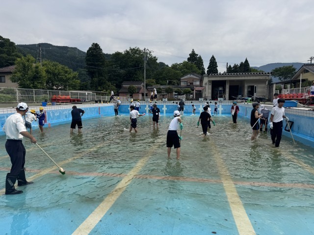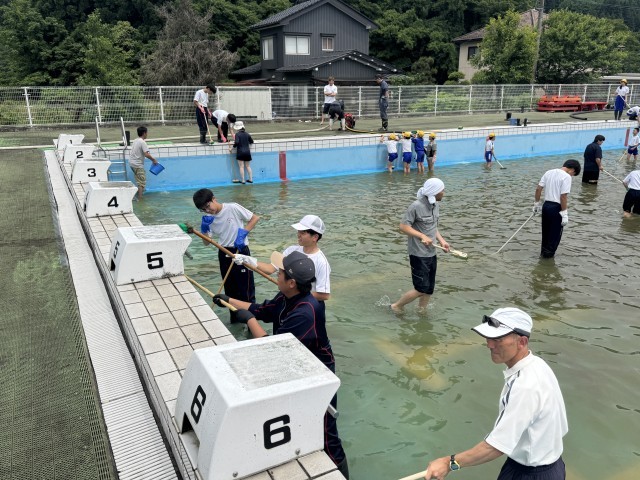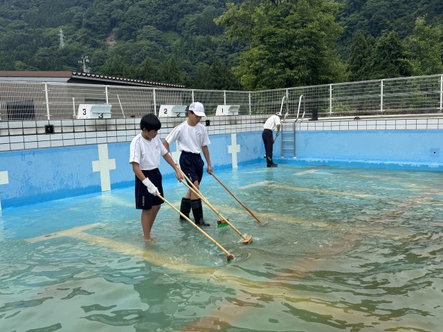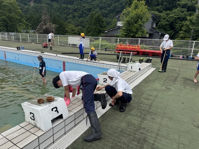 プール清掃の様子です。今年は水が多く、プールの壁磨きや落ち葉を取る作業を中心に活動しました。中学生も自分達ができることを一生懸命取り組んでいました。暑い中での作業お疲れ様でした。