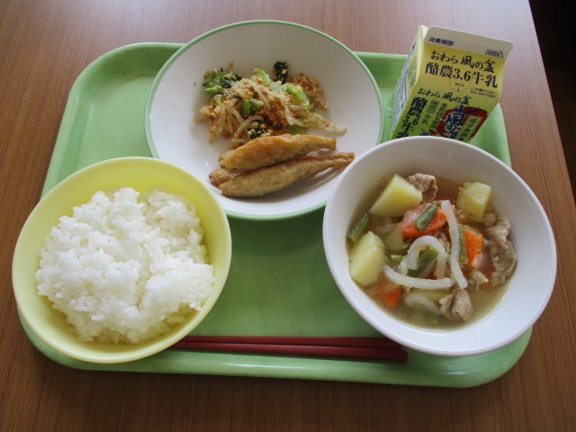 いり大豆和えはだいずの香ばしい香りとやさいのシャキシャキ感があふれるものでした。いり大豆和えは私的ベスト給食トップ10にはいる大好きな献立で、野菜をいくらでも食べられるようになっています。これもまたごはんと合います。