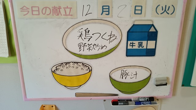 豚汁、鶏つくね、野菜炒め、ごはん、牛乳です。