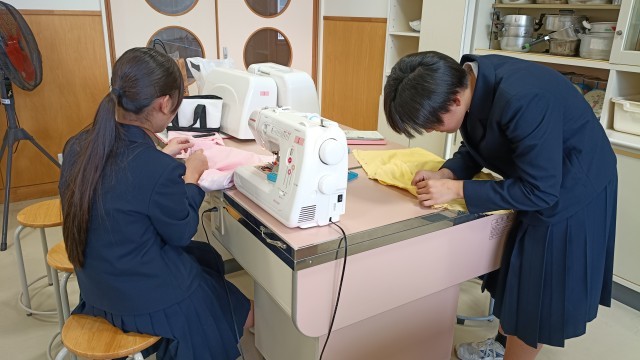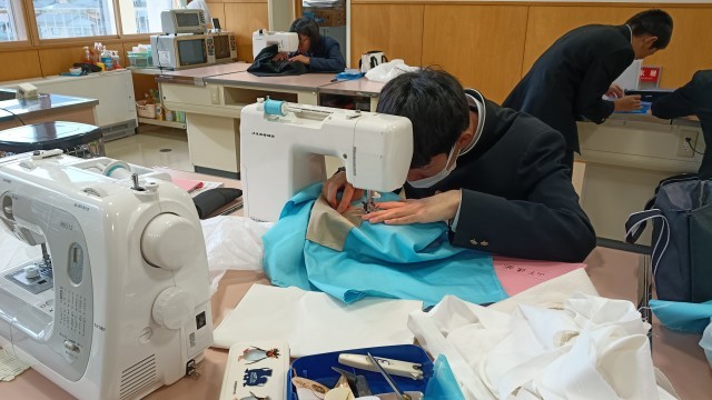 2年生は家庭、ハーフパンツ作りを引き続きやっていました。