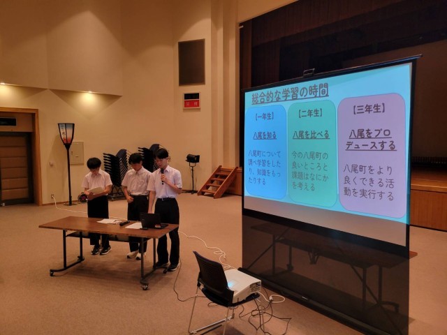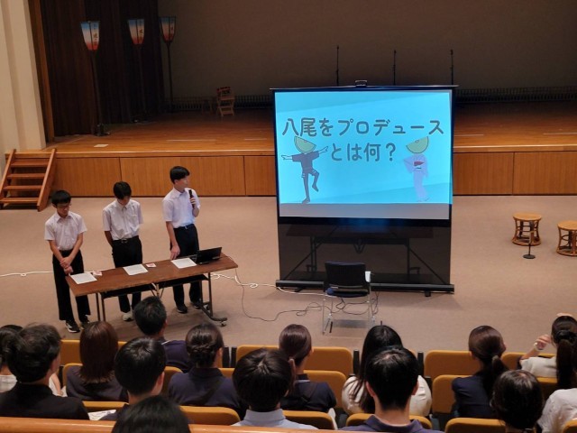 越中八尾観光会館で3年生の代表生徒が、旅行会社の方々に、自分たちが取り組んでいる内容を説明しました。この後、旧町各地の探索にも同行し、八尾の魅力を発信しました。