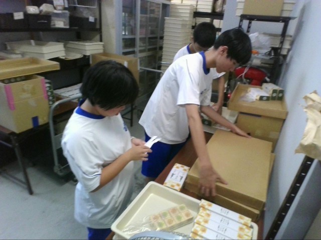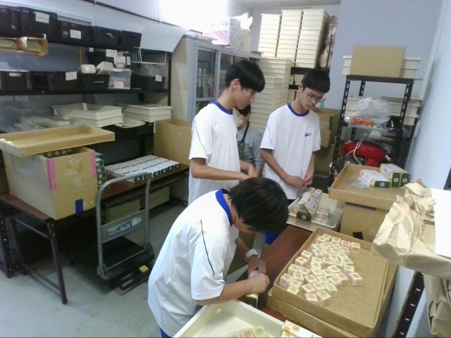 ここでは、グッズ販売部が銘菓の包装をしています。