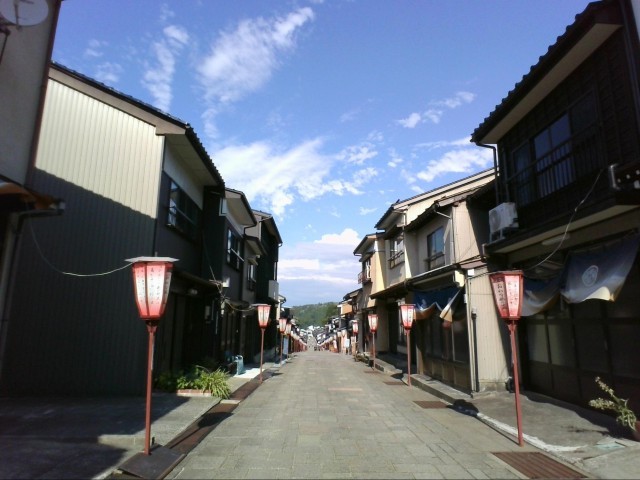 東新町から見た風景です。坂の下まで続くぼんぼりがとても美しいです。