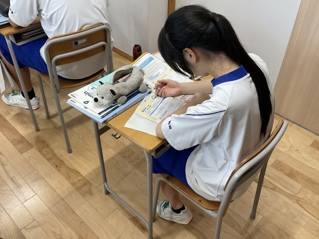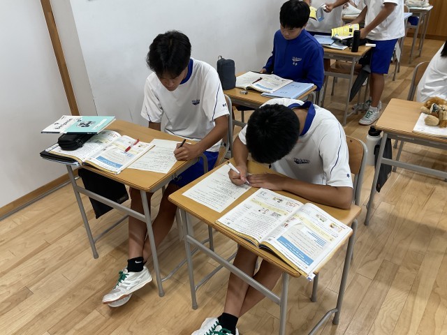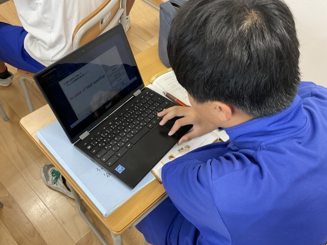 英語の授業の様子です。要点の読み取りに挑戦しています。レベル別の問題を自分で選択し、一人で考えたり、席を移動して友達と教え合ったりしながら各自の課題に取り組んでいます。読み取りの後は、教科書のQRコードを読み込んで+αの問題に挑戦します。
