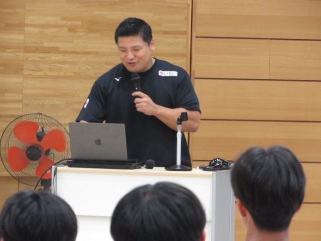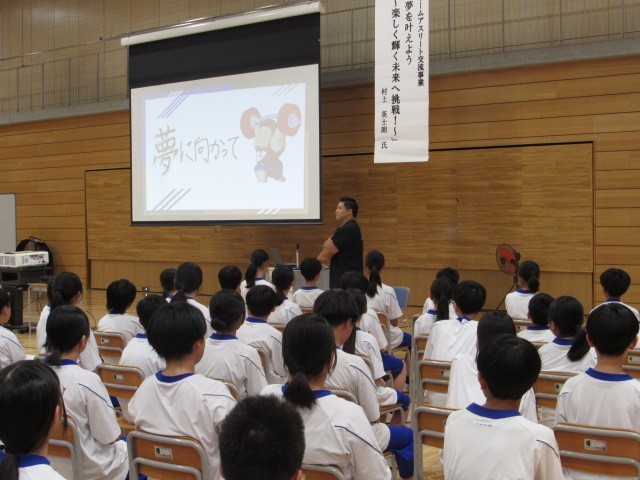 ウエイトリフティング競技で日本代表としてパリオリンピックに出場された、富山市出身の村上英士朗選手を講師にお招きし、ドリームアスリート交流事業を行いました。「夢を叶えよう~楽しく輝く未来へ挑戦!~」と題し、ご自身のこれまでの道のりやこれからの展望について、分かりやすく講演していただきました。ご自身の武器は、強い下半身だそうです。また、パリオリンピックに出場するまでは決して順風満帆ではなく、スランプ・挫折も経験されたそうです。しかし、よきライバルとの出会いや世界で戦いたいという強い思いでトレーニングに励み、出場権を獲得されました。2028年のロサンゼルスオリンピックでのメダル獲得を目標に、今も努力を重ねていらっしゃいます。生徒には「好きこそものの上手なれ」という言葉を贈っていただきました。