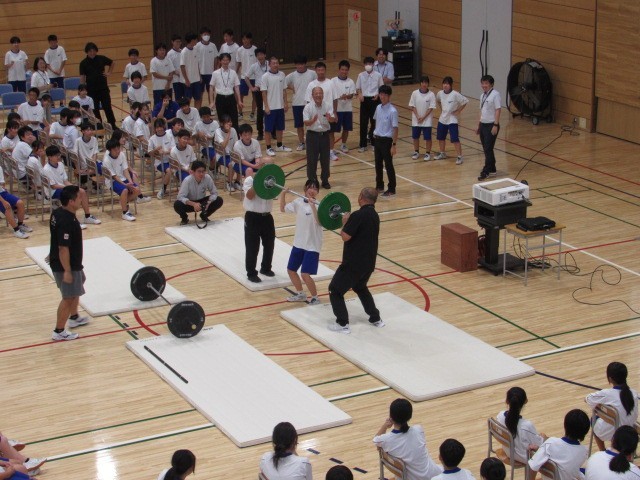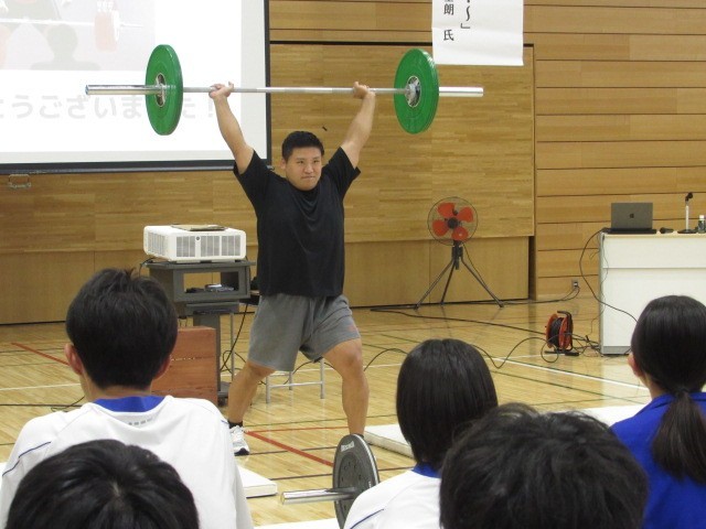 後半は、実際にバーベルを持ち上げる体験をしました。代表生徒は、歯を食いしばってリフトアップしていました。全校が一体となった、和やかで豊かな時間となりました。村上選手、本当にありがとうございました。