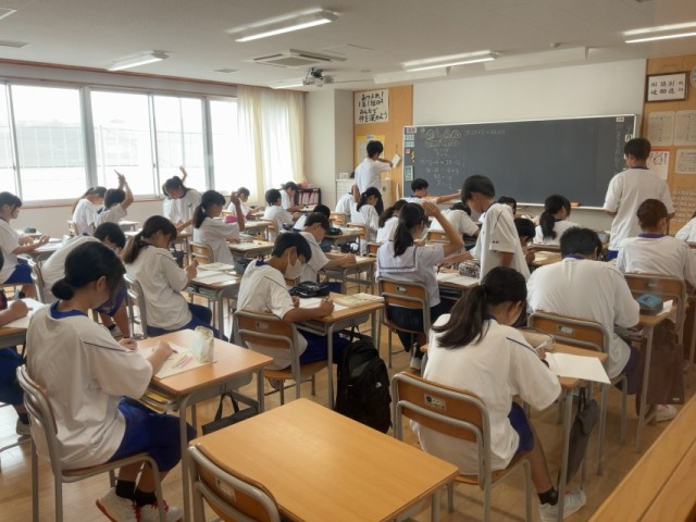 数学の授業の様子です。方程式を解いています。友達と教え合いながら取り組んでいます。1学年、元気いっぱいです!