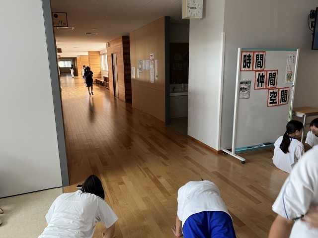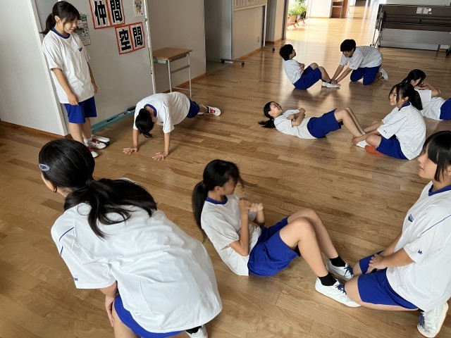 今日は、部活の始めに筋トレを行いました。肺活量をアップさせるためのトレーニングです。