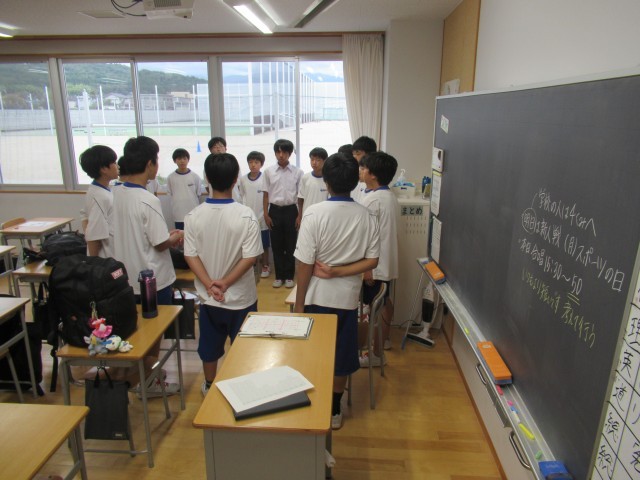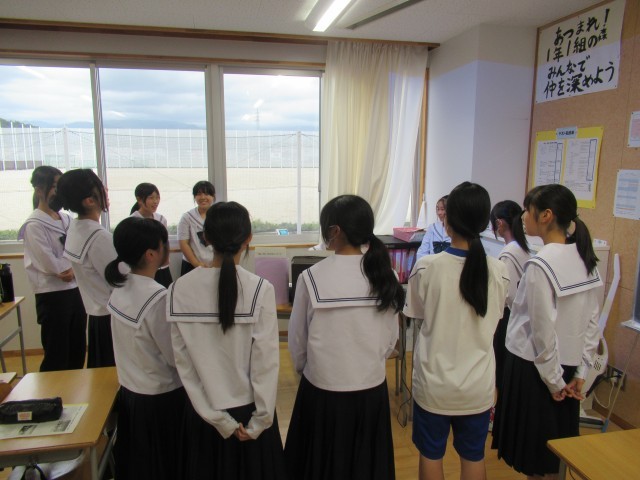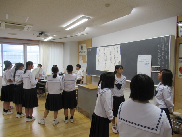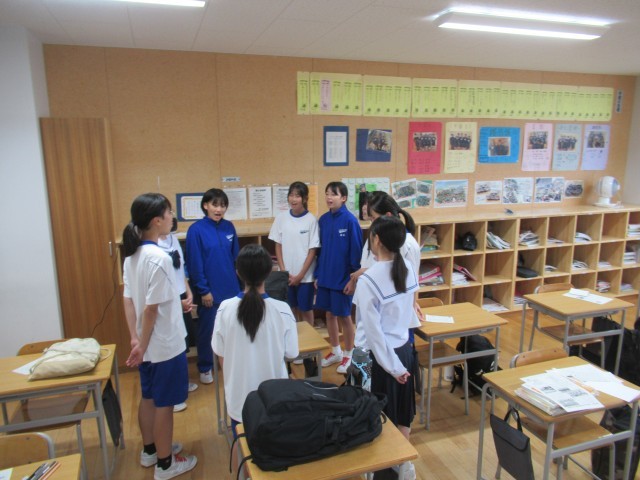 合唱練習の様子です。決められた30分という時間を有効に使おうと、終学活を定刻に始められるようにみんなが協力したり、チャイムと同時に「机を下げよう!〇〇はどこそこで練習して!」というリーダーの声があったりしました。今日も、まずは各パートがしっかり歌えるようにとパートごとの練習を熱心にしていました。