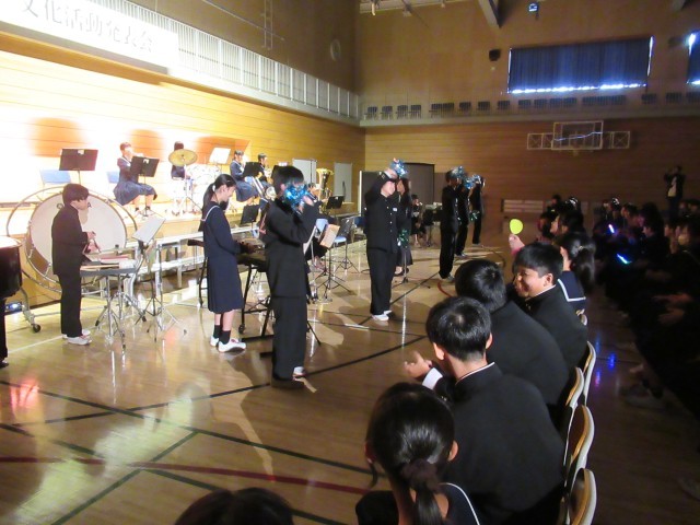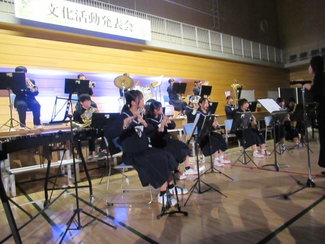私たち吹奏楽部は、部員20人程度で活動しています。学校行事はもちろん、地域の活動にも積極的に参加しています。先日もシルバーフェスティバルに出演しました。今日は、「怪獣の花唄」や「可愛くてごめん」、そしてアンコールには「ケセラセラ」をお届けしました。