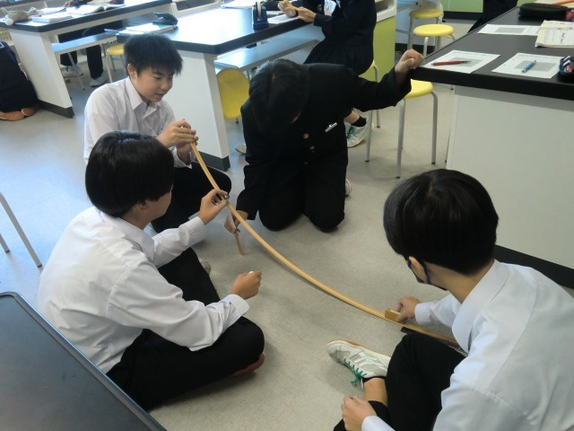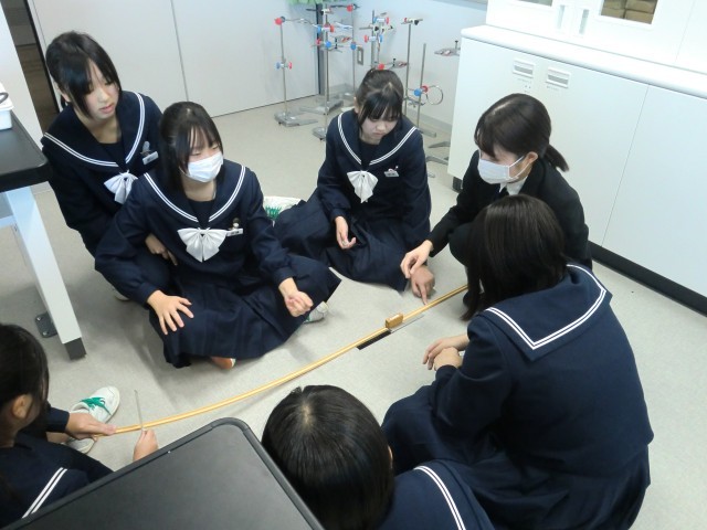 理科の授業では、実験を通して仕事の大きさを調べています。先生にもアドバイスを受けながら実験しています。