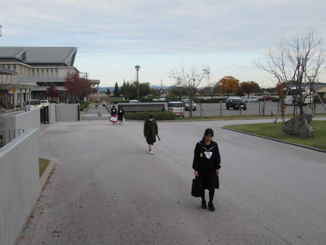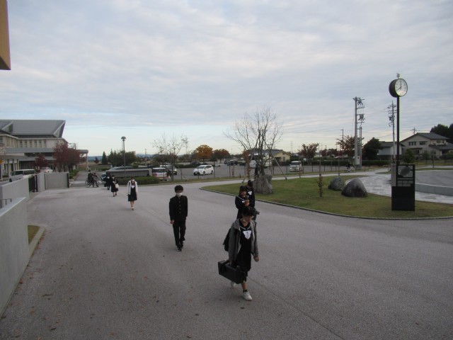 雲が広がっていて肌寒い朝、でも元気のよい挨拶の声が飛び交う生徒玄関です。
