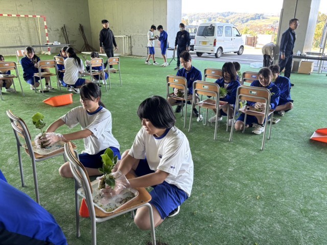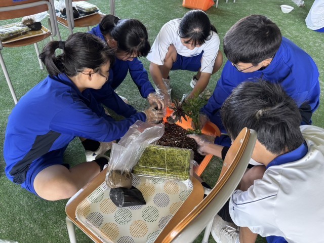 今日の2・3限に苔玉作りを行いました。説明を受けながら、自分の思い思いの苔玉を作りました。