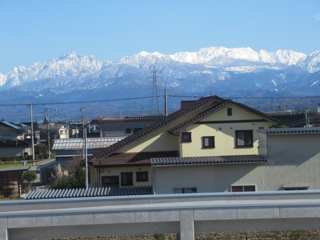 雲一つない青空に立山連峰が輝いています。