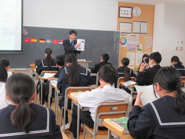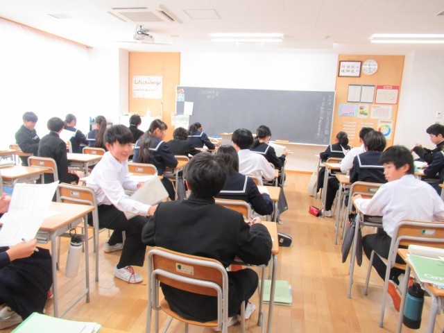 4限の授業 1組は保健体育 バスケットボールが始まりました。 2組の英語ではALTと英会話の実践を。3組社会と4組理科は、期末考査の解答用紙が配られて、その見直しをしていました。