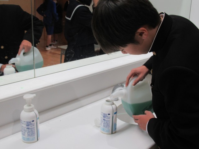 次の画像はシャボネットの補充の様子です。欠かすことなく、みなさんの衛生のためにありがとうございます。