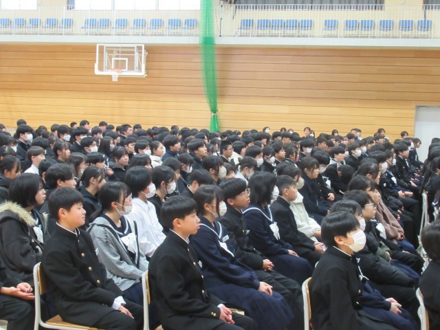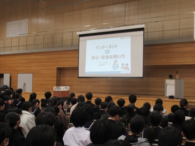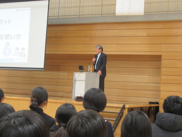 午後から、インテックの干場進二氏を講師にお迎えしてお話を伺いました。ネットへの投稿、ネットの使い方、ネット上の偽・誤情報、ネットの特性について動画を交えながら気を付けるべきことがらを分かりやすくお話いただきました。学校では人権週間の取組を行っている最中でもあります。ちょうど本日の新聞にも、ネットによる犯罪行為が特に学校内で増えている現状が記事として載っていましたね。みんなで、そして一人一人が注意して、安心で安全な使い方をしていきましょう。