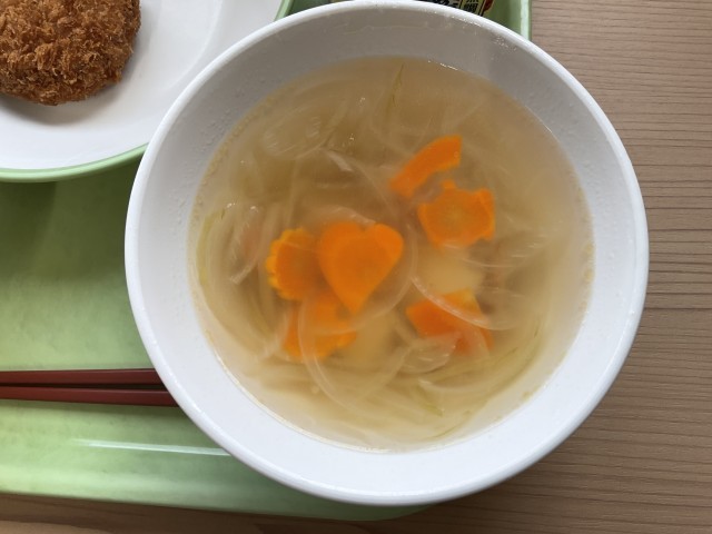 今日のスープには、いろんな形に形どられた人参が入っていました。サラダも華やかな感じで、給食に携わる方々の、私たちへの愛情を感じ取ることができました。気温は低いのですが、身も心も温まる給食…本当にありがとうございました。