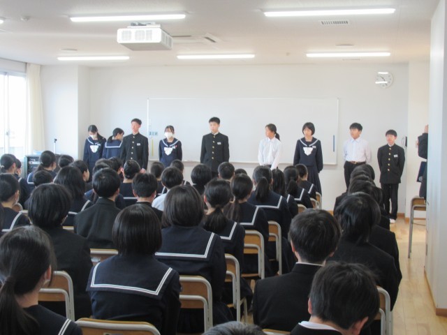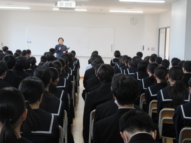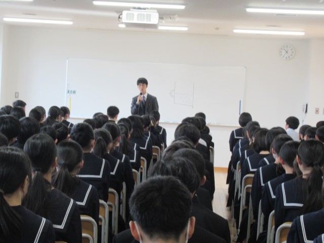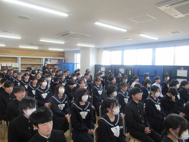 2学期を総括する学年集会を行いました。学年生徒会からは、2学期にあった多くの学校行事を通して頑張ったことや成長できたこと、一方で今後改善していくべきことなどが発表されました。引き続いて学習について、どうして勉強するのかを『水の入ったコップ』をもとに。また、生活面については、SNSの扱い方を中心に、うわさ話や虚言の悪影響などについてお話がありました。最後に学年主任からは、2学期は学年としてとても頑張っていたこと、それが頼もしくも誇らしく思えたと。2026年を迎えるにあたってその節目を大切にこの1年を振り返って今後の目標を立ててほしいこと。そして3学期は、自分の可能性を信じ、努力することを通して『見せる』2年生になってほしいという思いを話されました。