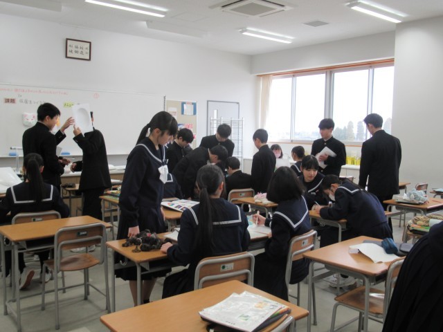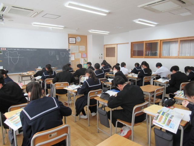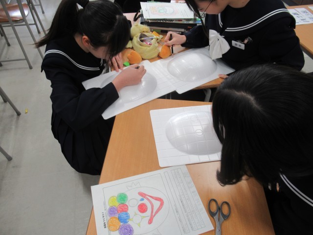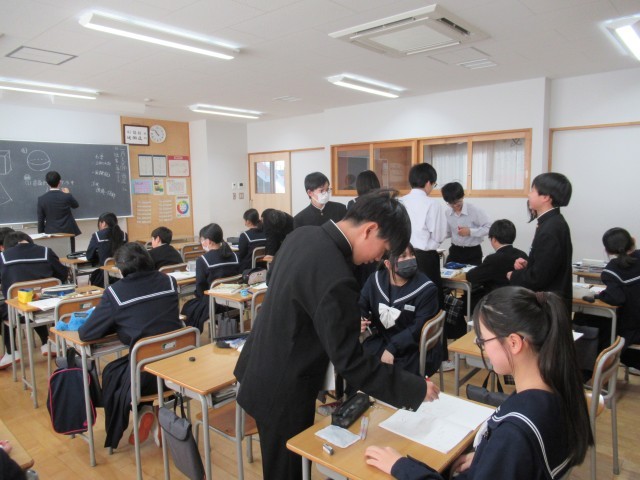 1組:社会「アフリカ州の地形と気候の特徴」地図を書いて、気候区分の色分けをしていました。 2組:美術「仮面を作ろう」デザインを発泡スチロールに写し書きしていました。 3組:保健体育「バドミントン」 4組:数学「いろいろな図形」の教え合い学習をしていました。