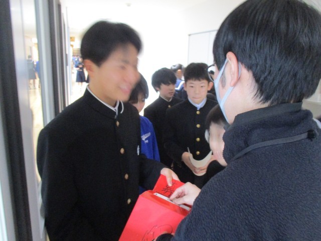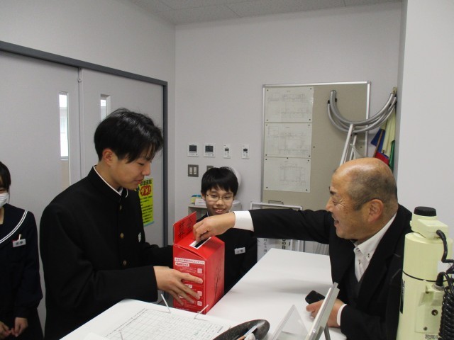 朝の登校時、多くの生徒が募金に協力していました。また、昼休み、職員室の先生方に協力を募り、募金してもらいました。