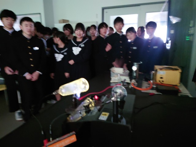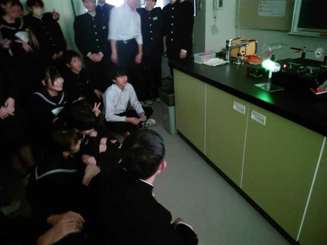 各班で、異なる2種類の物質(塩化ビニルパイプとセーターの生地)をこすって蛍光灯が光るか実験しています。