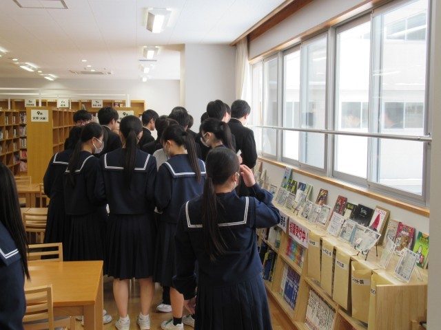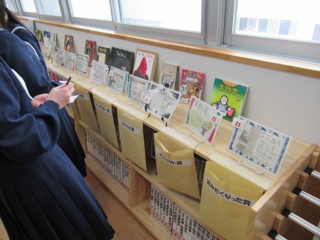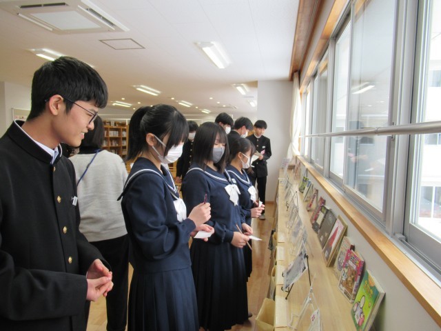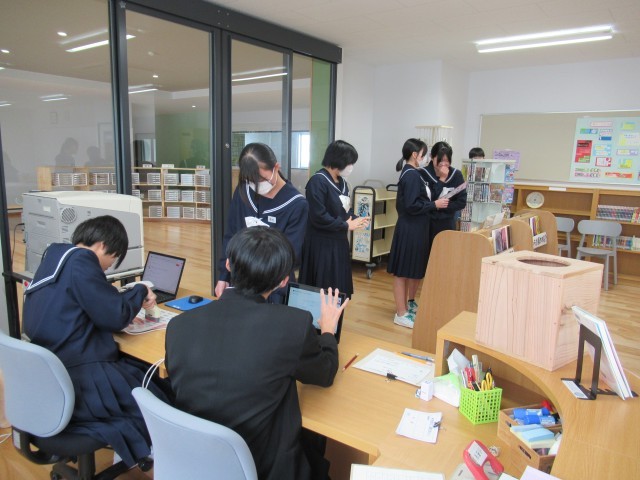 図書委員会は、皆さんに1人でも多く、1冊でも多く、よい本を読んでほしいという願いから、様々な活動を頑張っています。それに応えるように本の貸し出しに、また「ポップコンクール」の投票に多くの生徒が図書室を訪れていました。