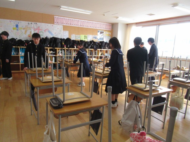 椅子の脚についた埃をふき取っている生徒もいました。