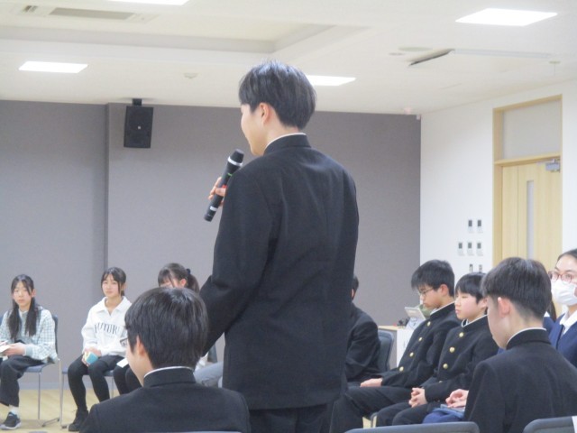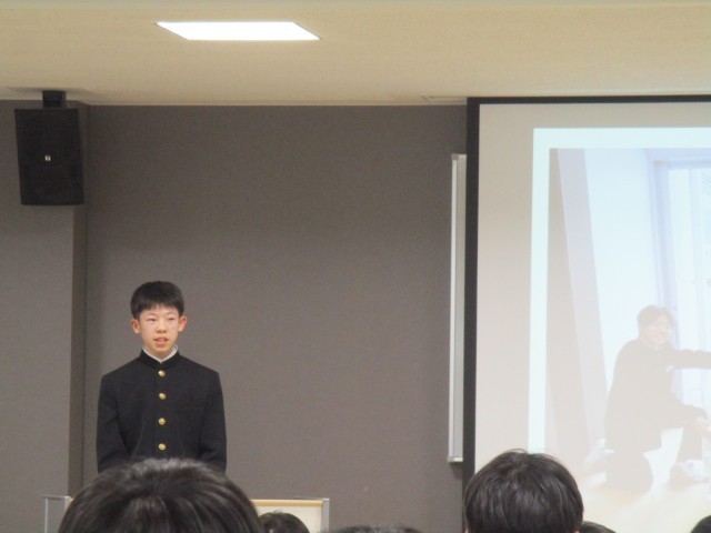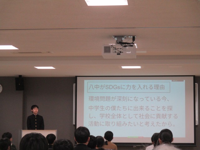 生徒会では、SDGs17の目標の中で12番「つくる責任 つかう責任」に着目し、取り組んでいる4つの活動について報告しました。