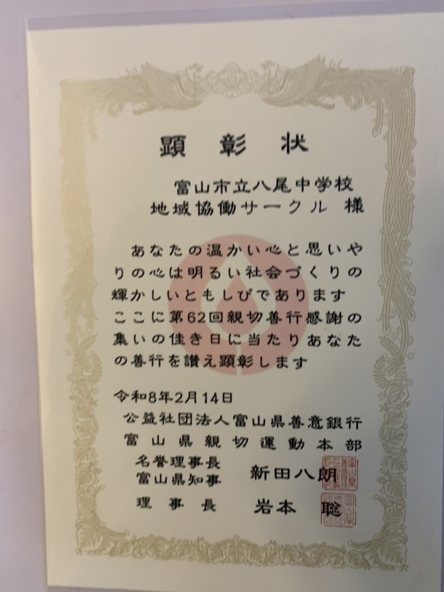 本日、第62回親切・善行感謝の集いがあり、教育部門の団体の部で本校の地域協働サークルが、個人の部で本校生徒が顕彰状をいただきました。