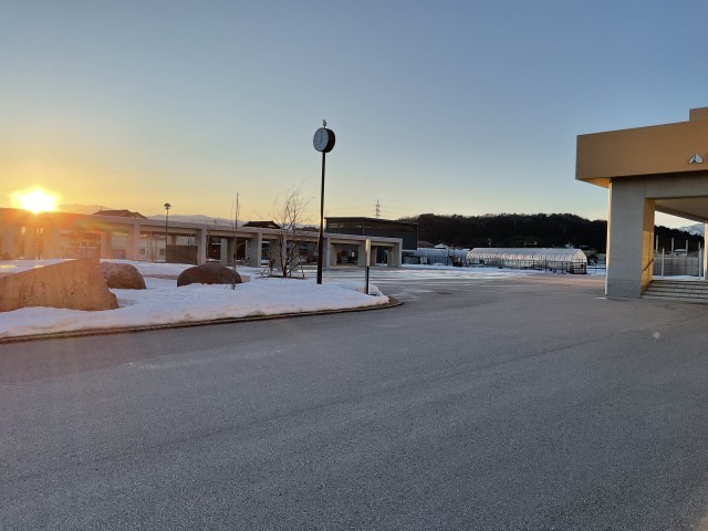 快晴の朝を迎えました。そのため放射冷却現象が起き、路面は気付かないところで凍結部分がありますので、足下に注意して登校してください。