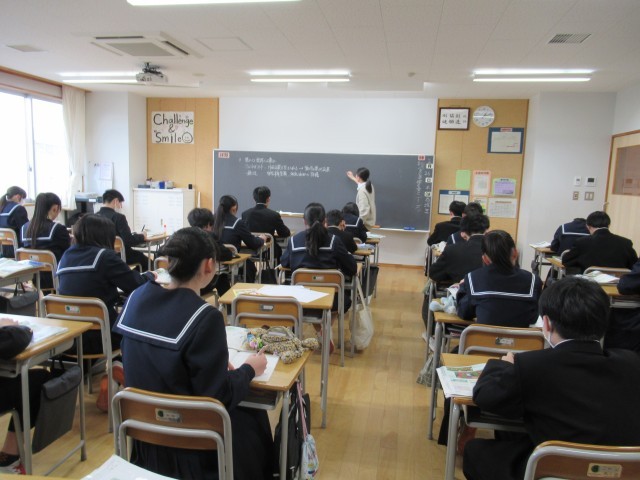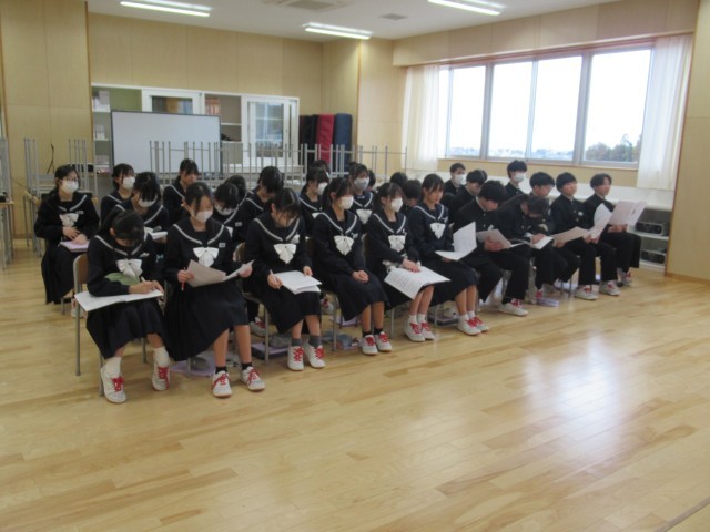 授業の様子 公開日 2026/02/26 更新日 2026/02/26 1学年 今日の5限の1組の授業は、「数学」で、正負の数・式と文字の計算プリント記入の、2組は「社会」で、「南アメリカ州の豊かな資源と工業化」の、3組は「音楽」で、卒業式に歌う歌の練習の、4組は「保健体育」でバドミントンの授業でした。 +2