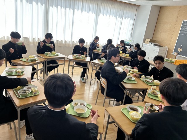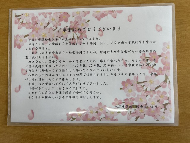 ついに中学校生活最後の給食の時間でした。本日の給食のワゴンには、調理員さんからの特別なメッセージが添えられていました。今まで食べた給食は1700食にのぼると知り、驚いたり自分の成長を実感したりしていました。多くのクラスは今日は班にかかわらず大きな輪になって食べています。食事を通して仲間とつながる貴重な時間を過ごしていました。