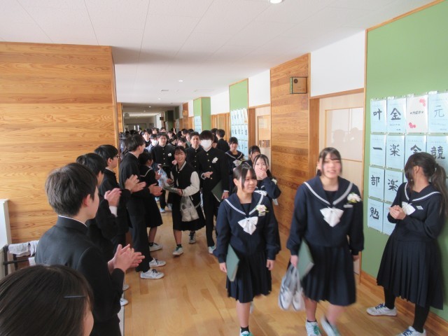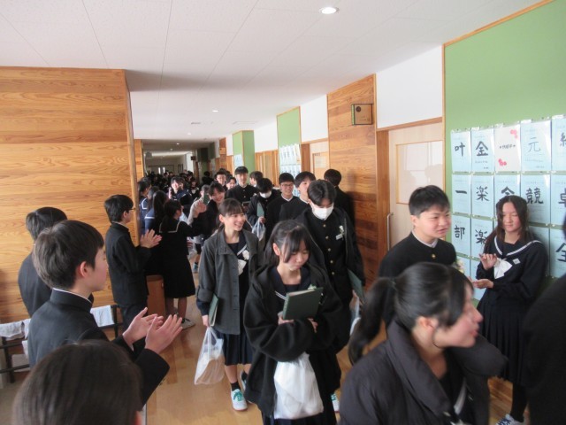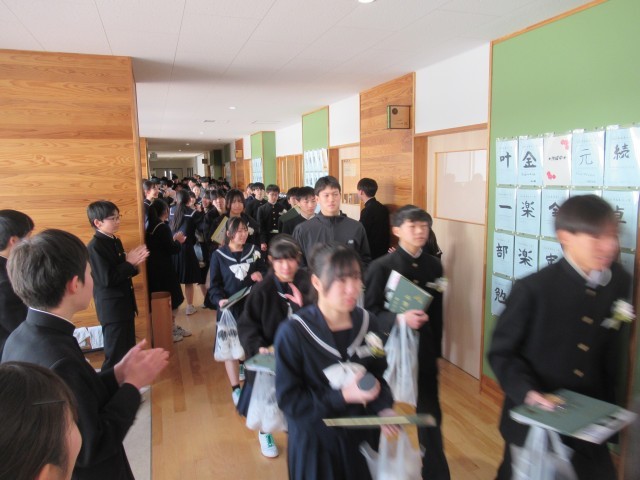 歓送で、花道を通る卒業生は、お世話になった先生や後輩たちから、温かい拍手で見送られました。吹奏楽部は、いきものがかりの「ありがとう」や「世界に一つだけの花」等を演奏して、送り出してくれました。