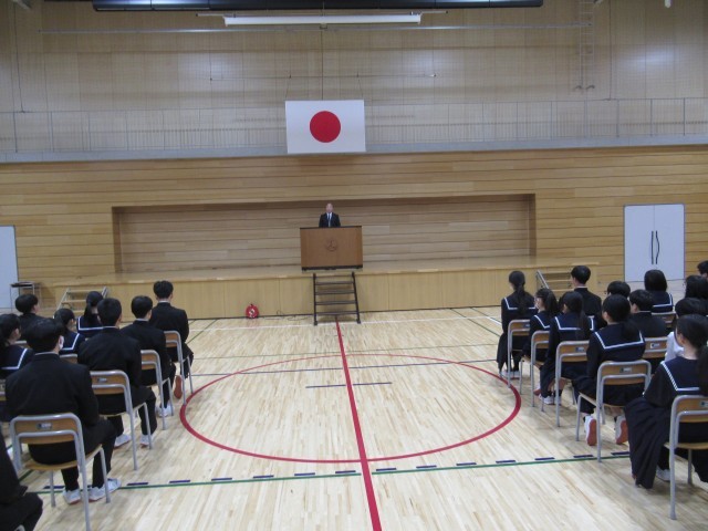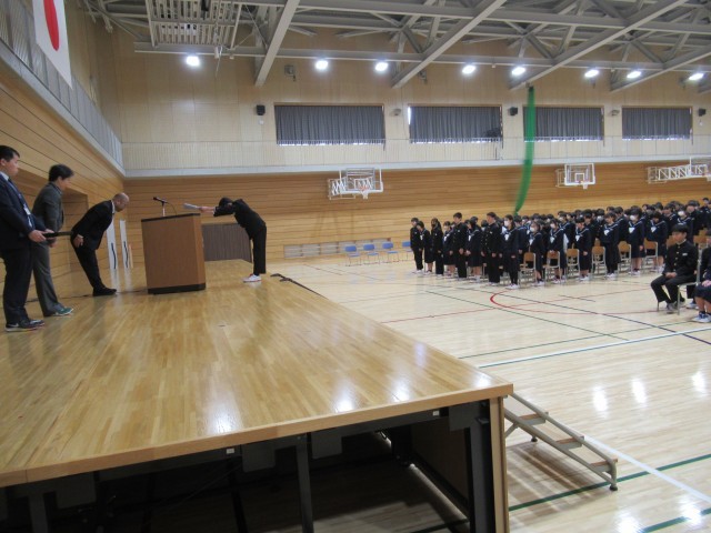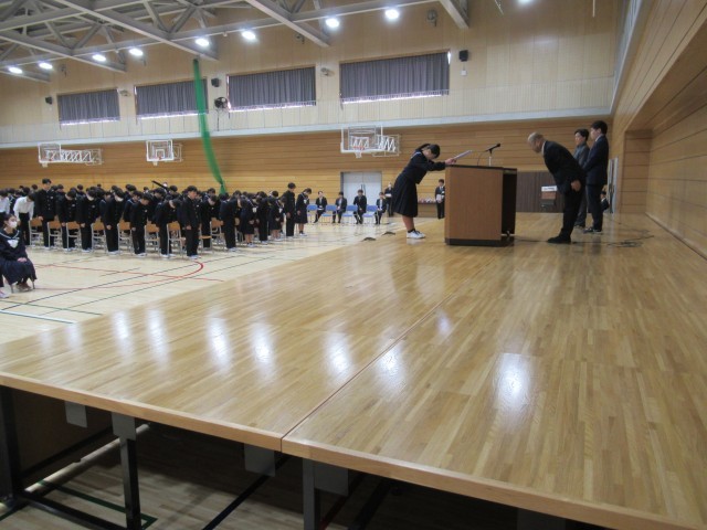 式辞では、1年生は次の「見せる学年」になるために、自分が示す姿を考えてほしい。2年生は最終の「見せつける学年」として、1,2年の先を進み、行動で示してほしい。そして、凛とした姿で、新学期を迎えてほしいと話しました。