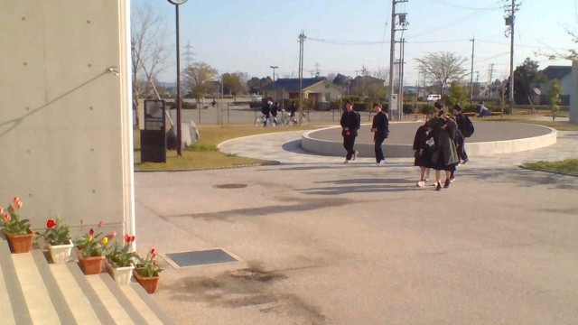快晴の下、八尾中生は元気な挨拶を交わしながら登校しています。