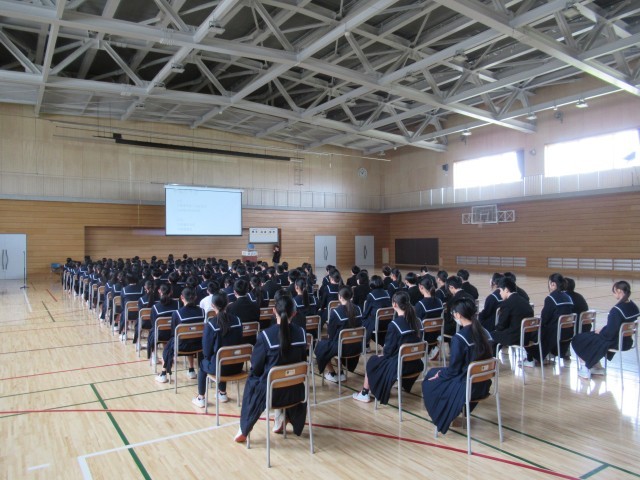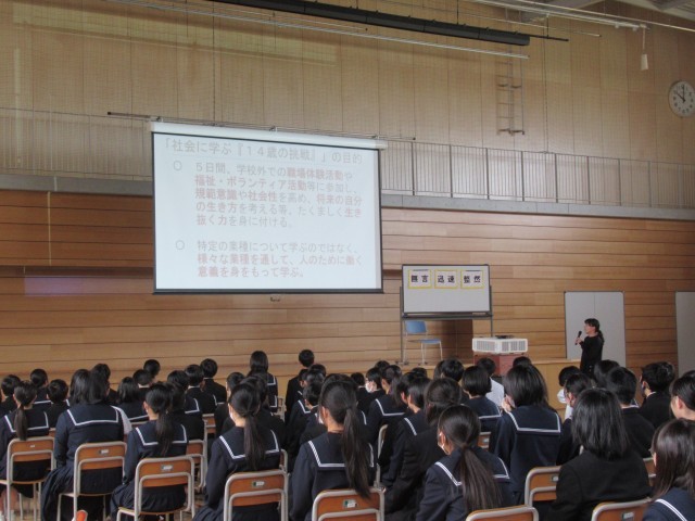 2学年の学年集会で、14歳の挑戦についてガイダンスを行いました。