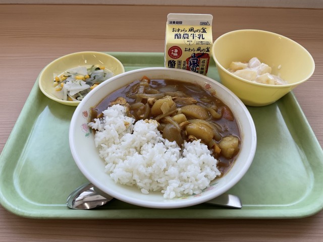 1年生にとっては中学校生活初めての給食です。この記念すべき日の献立が、人気度の高いカレーでとっても嬉しいです。さらにフルーツヨーグルトも、好きな人も多いと思います。私は自宅でカレーをよく作りますが、鶏肉を使うことが多いです。チキンをキッチンできちんと下ごしらえしてから調理するようにしています。