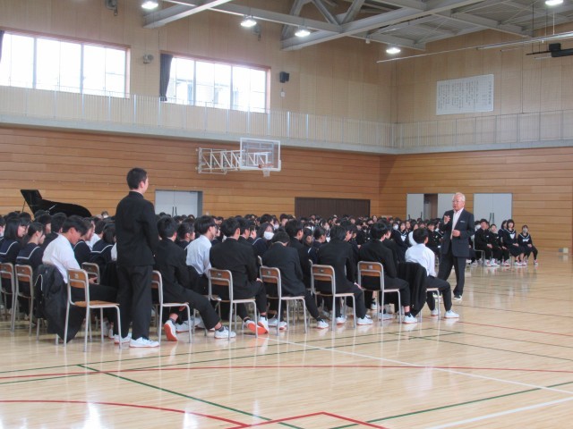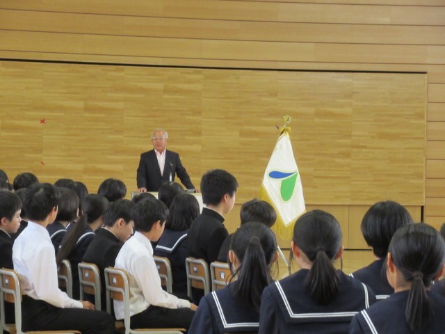 本日は開校記念式を行い、本校の学校運営協議会会長の松木様にご講演いただきました。