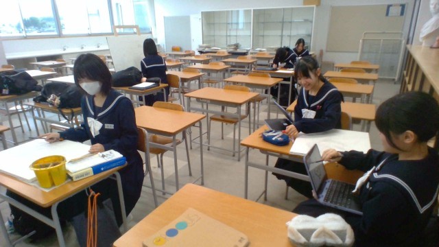 美術室では、美術部員が大きなキャンパスに下絵を描いたり、描く材を調べたりしていました。