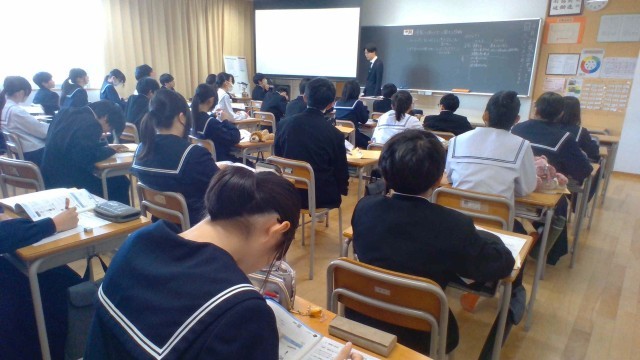 生徒は、スクリーンを見ながら学習内容を確認しています。