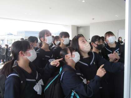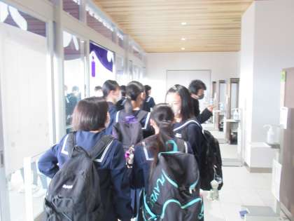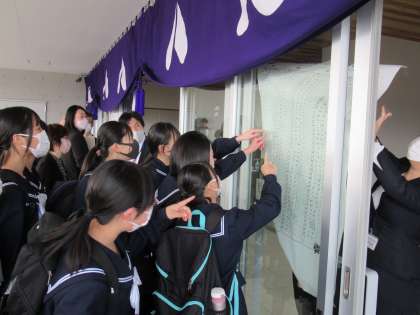 玄関に学級発表の模造紙が掲示されたとたん、生徒たちは生徒玄関に駆け寄っていきます。