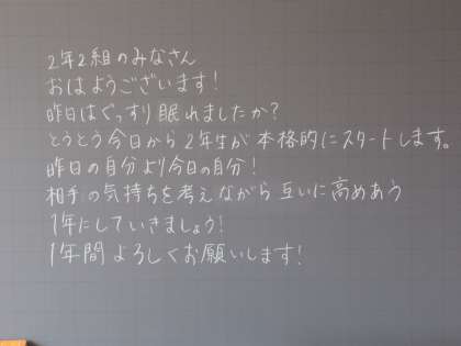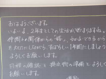 教室の黒板には、担任の先生からの温かいメッセージが書いてありました。