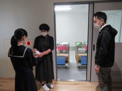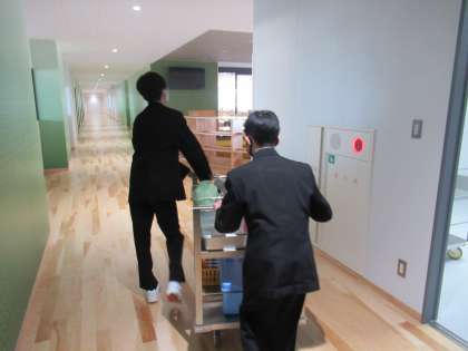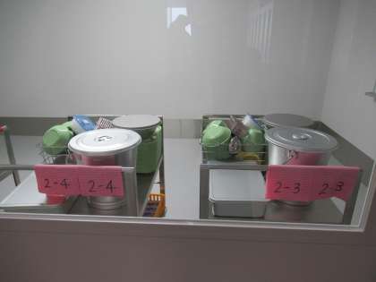 ワゴンが給食室からエレベータで上がってきて、ワゴンプールという部屋で保管されています。