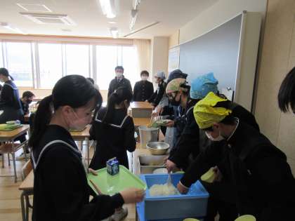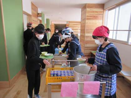 準備の方法は同じです。給食当番は手洗い、消毒をし、配膳をします。